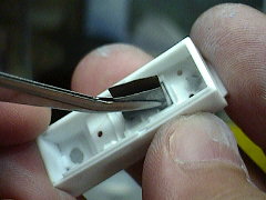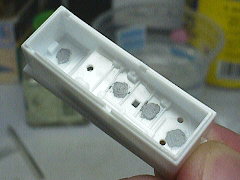 固まったら表面を彫刻刀である程度削って、ペーパーで仕上げます。狭いところなので、細く切ったペーパーをピンセットで挟んでペーパーがけしています。