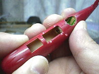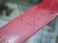 主翼に0.6ミリの穴を開け、瞬間接着剤でパイプを接着します。穴の位置は、パーツにあらかじめマークが付いているのでその位置を開口しています。