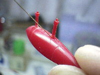 フロート補強用の張線のしかけを作ります。張線には、テグスや木綿糸などを使うのがオーソドックスと言えますが、今回は真鍮線を使うことにしました。