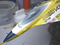 マスキング漏れがあったので修正します。マスキングテープを貼り、はみ出た部分が修正個所です。