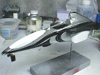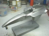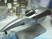 シルバーの上からスーパークリアでコーティングしました。このあとはノーズの蛍光レッドやサイドポンツーンの黒などを塗り分けていく予定です。