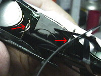 ディフレクターの固定に両面テープを使いました(矢印)。瞬間接着剤だと位置を決めるのに余裕がなくなってしまい、木工用ボンドでは固まるのに時間がかかりすぎるためです。