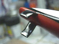 フロントウィングは吊り下げられた形をしています。この腕の部分に組み合わせるわけですが、塗装やクリアコートによって厚みが増してしまい、入らなくなってしまいました。