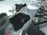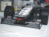 フロントウィングは瞬間接着剤で接着しています。タイヤを履いた状態で1mmのプラ板をスペーサーとして地面に置き、その上に乗る高さで固定します。