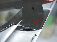 瞬間接着剤を使ったため、乾燥後に白く曇ってしまいました(矢印)。これは運が悪いというか、仕方ないことです。後で筆でリアルブラックを塗ってリタッチしています。