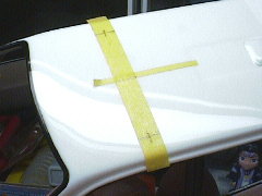 で、パトライトの位置決めをするため、説明書の図面を見ながらボディの屋根のマスキングテープを貼って穴の位置をプロットします。