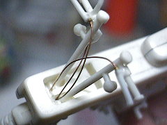 ブレーキワイヤーと速度メーターのケーブルを追加します。ワイヤーは0.2mmの真鍮線を使っています。加工しやすくするために、真鍮線は一度ガスコンロの火であぶって軟らかくしてあります。