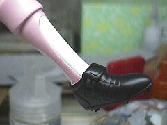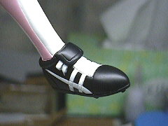 ストッキングもマスキングして塗り分けています。塗り分け部分のピンクを筆でリタッチした後、もう一度足首から上をマスキングしてスパイクの黒をエアブラシで塗装しています。