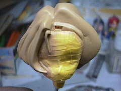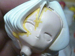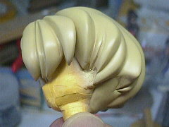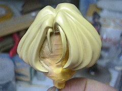 前髪の一部だけ別パーツになっていましたので、グラデーションをかける都合から塗装時に接着してしまいました。瞬間接着剤で点止めして(結果的に点でしかくっつけられなかった)パーツの隙間に木工用ボンドを流し込んで補強しています。