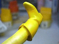 予定どおり、足を接着する前にブーツを塗ってしまいます。スネの部分の黄色はマスキングテープの色です。