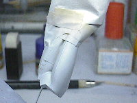 すみれの教訓から、サフを吹き直すことにしました。ヒザから下はズボンの色を塗ってあるのでマスキングしています。