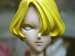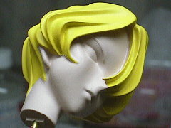 顔をマスキングして髪の毛を塗っていきます。はじめはホワイトにイエローを混ぜた色を下地として吹きます。