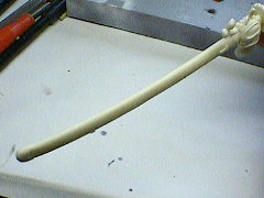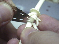 鞘の部分の修正はできましたが、柄とのバランスがおかしかったので取り付け角度を修正することにしました。鞘の根元近くに鋸で切れ目を入れて、その部分を瞬間接着剤で接着し、角度を変えています。
