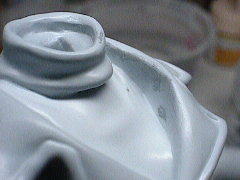 気泡はプラパテで埋めていきます。ひとつひとつにこのようにパテを擦り込んでいきます。ある程度固まったらペーパーできれいに磨きます。