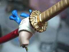鍔は金色で塗ります。ここが鷹の模様になっていたんですね〜。知りませんでした。金は筆塗りです。