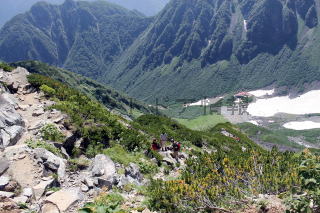 この付近まで来るとかなり展望が良くなってきます。ザレた岩場の道を登ることになります。所々休憩も可能です。振り返った写真が、右側写真で、涸沢のテント場付近が眼下に良く見えています。