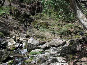川を渡ると植林帯となります。その後、右側写真の所で大きく左へ曲がります。この辺りから登りがだんだん急となります。