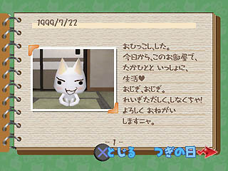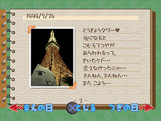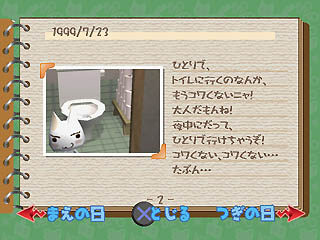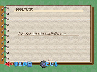 最初、絵日記が存在する事を知らず遊んでいたが、インターネットの有るサイトで絵日記の文章を公開していた、それでようやくその存在を知った。(説明書読んでないのバレバレ)。で、見てみた。初日は誰も同じなのね。明日からに期待。