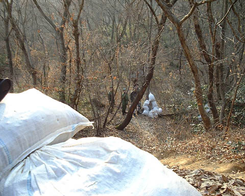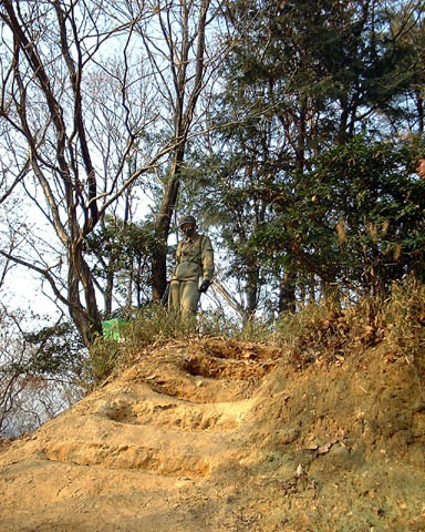 守備陣地は2段になっていて、ここは上の写真の位置から上の段を見上げたところ。さっきから裏と表現しているのは2段目の奥の事で、こちらは坂も急だけれども視界も悪い。