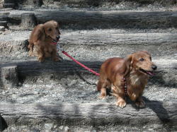 こうやってシェリーとプルート君が一緒につながって自由に(?)散歩するとき、いつもリードするのは息子のプルート。 好きな場所や駆け出しも常に先に! それについて行くのがシェリーママだけど時には急ぐプルートをセーブしたり、危ない所へ行かないように踏みとどまったりと母親ぶりも板に付いたもの。 |