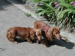 | ママ、早く行こうよと同じ絆(笑い)で結ばれたプルートはその有り余る体力で、シェリーママを引っ張る。 おいおいそんなにママをリードするもんじゃないよ(主人談) |