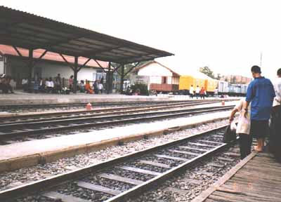 | アユタヤへの交通手段はいくつかある。まずは鉄道を使う方法である。 バンコクのファランポーン駅から一日29本、所要時間は1時間30分前後で運賃は3等15B(57円)、2等35B(133円)。 ご覧の車両は3等の部分。外観は日本の電車とあまり変わらなく、座席はすべてボックスシートとなっている。 ただしシートは木製。長時間座っているとお尻が痛くなってくる。 2等を使えば少しは快適なんだろうけど、3等以外は乗ったことがないので分からない(笑)。 またバスを利用する方法もある。タイでは各都市間の交通手段として長距離バスが頻繁に利用されている。 ちょうど日本の観光バスのようで、エアコンの無い普通バス・エアコンバス・ そしてリクライニングが深く座席の幅が広いVIPバスに分かれている。 アユタヤへは15〜30分間隔で運行されており、料金は普通バス20B、エアコンバス30B。 その他チャオプラヤ川をリバークルーズで行く方法もある。料金は高いらしいが情緒満点なので私も一度乗ってみたいなぁ。 |