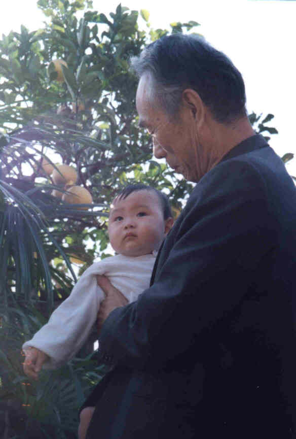 正月に 文旦(日本版グレープフルーツ)をバックにおじいちゃんに抱っこしてもらいました。 後で食べたら、ちょっと苦かったけど美味しかったよ!