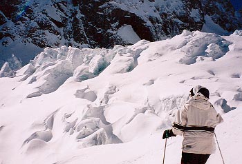 前日(7/27)の悪天候と対照的にこの日はいい天気。残った1日のスキー予定日を、ヘリコプターで山の頂上に登り、そこから新雪を滑る「Heliski」に挑戦。これはそのときの山頂からの風景です。こんな氷河のそばも滑りました。 |
