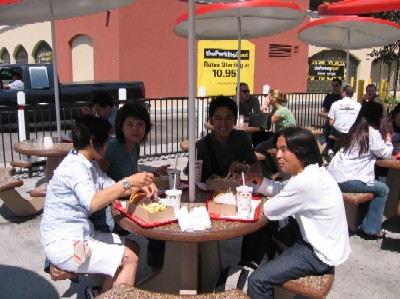 この日に帰国する予定の小嶋さん夫妻、鈴木さんを空港までお見送り。次回のパンケーキと趣向を変えて、LAX空港そばにあるイチオシの ハンバーガー屋にて朝食兼昼食です。この日もやっぱり、朝食抜きました(2回目の爆笑) しかし、ここのバーガーはやっぱりいい。 |
