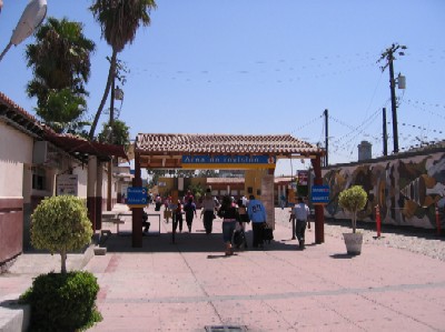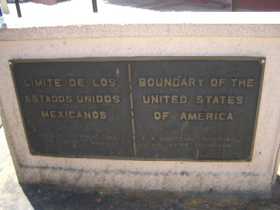 | "Real" border line 2004-08-28 これぞ国境線。左側がメキシコ、右がアメリカです。回転ドアに挟まれた中央あたりにこの碑があります。 |
