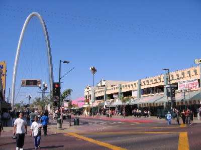 | Ave. Revolucion 日本名では革命通り。う〜む...ティファナの雑踏をうまく表現できなかった。現地はこんなもんじゃありません。歩く人は多いが、それよりもうざい客引き が多いこと多いこと...どこで判断してるのか、カタコトで「社長!」とかいろいろな日本語が飛び交います。 |