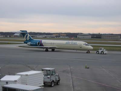 Airtran Jet @ Rochester Airport 2004-12-04 今回使ったのは、格安系飛行機会社のAirTran。わたしはアットマーク"@"が尾翼にあるのかと勘違いしてました。機内サービスは いたってまとも。親切さという意味では大手と同等、もしくはいいかもしれません。 |