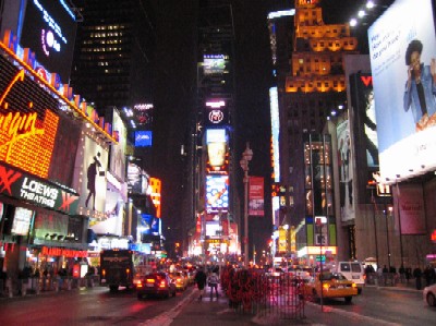 | Times Square(1) 2004-12-26 劇場が立ち並ぶ、夜のNYがにぎわう場所のひとつです。この写真はミュージカル終了後の夜22時ごろに撮影したものですが、まだこれだけクルマが走っています。 ホントはショーの前に夕食をしっかり取りたかったのですが、あまりの混雑でマクドナルドで夕食を取った始末...この周辺で夕食を考えている方は、予約をばっちり入れるか、よほど並ぶ覚悟を。 |