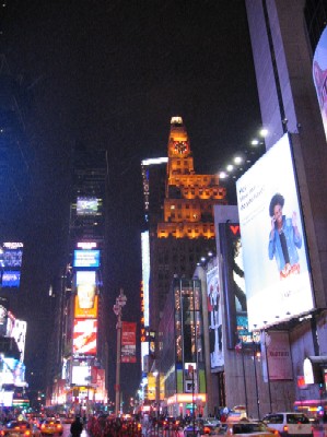 Times Square(2) 2004-12-26 タイムズスクエアの語源ともなった、時計台です。その左隣にあるネオンの柱の上部に、年末年始のカウントダウンの時には電飾の仕掛けがつけられまして、大晦日の夜はここがまた一段と大賑わいとなるのが恒例行事です。 今年はどこぞのチャンネルがその模様をテレビ中継しておりましたが、新年となったと同時に紙吹雪が舞っておりました。きっとその翌日(新年)に行ってたら、さぞ汚かったことでしょう。 |