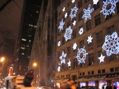 ロックフェラーセンターとは5番街を挟んだ反対側に、また個性的な電飾をつけたビルと教会がありました。その前を、馬車が走っていきます。(左側でぶれているのが馬車&御者です) |