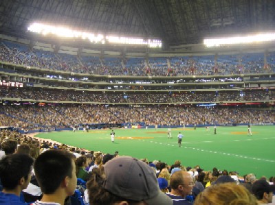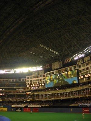 この日はヤンキース対ブルージェイズ。アメリカ対カナダですな。ということで、国家斉唱の時には、アメリカのとカナダのを両方やってました。 ちなみに、この日は松井選手出場日...ただし第一打席だけ。せっかく見に来て、内野ゴロ併殺打をくらいかけましたが、何とか一塁セーフ...ただし、その直後に代走が送られ、見れたのは最初だけ。 |