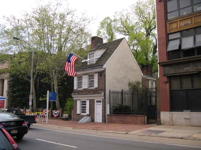 Betsy Ross's House 2005-04-23 独立時に星条旗を作った方が住んでいたのがこの家だそうです。中は彼女がデザインした星条旗(星が13個、円で配置してあります)のレプリカや18世紀の生活様式の家財道具が展示してあります。 家の前で、彼女に関連する劇が演じられることもあるそうで、この時は一人役者さんがいました。 |