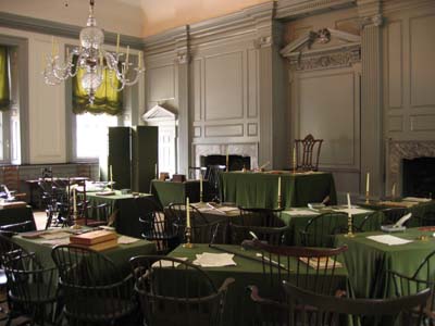Meeting room @ Independence Hall 2005-04-24 議論した場所がこちらだそうです。中央にある椅子は、実際にGeorge Washingtonが座った椅子だとのこと。 |