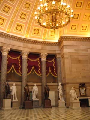 US Capital(3:Statue Hall) 2005-04-26 案内されてCapitalの中に入った二部屋目がここ。右側だったんでたぶん上院側だと思いますが、以前はここで議会が実際に開かれていたとのこと。 各州から石膏像/銅像が1〜2体寄贈され、ここに置かれているため、今の名前はStatue