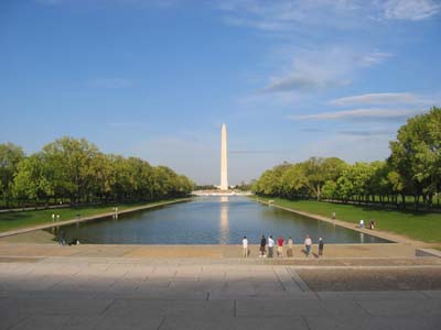 Lincoln Memorial 2005-04-26 リンカーン記念館(外観はpart.1参照)からの眺め。2回目の訪問の今回は、裏に彫られた文字までちゃんと読んできましたぞ。入って左側が「人民の人民による...」でした。 |