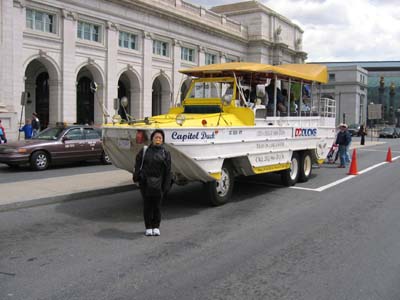 DC Duck Tour 2005-04-25 水陸を駆け回ったDuck号と記念撮影。一人30ドルで90分(2005年4月現在)というのは、いささか??な気もしますが、(1)ワシントンDCの概略をつかめる、(2)満64歳の軍用水陸両用車に体験乗車できる、という意味ではなかなかのお勧め。 ちなみに、乗るともれなく、アヒルの鳴き声がする笛をプレゼントされます。 |