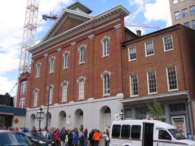 Ford Museum 2005-04-25 その狙撃された場所が、道路を挟んだここ、フォード劇場。未だに劇とかも上映されてるらしいですが、昼間の時間帯は上の家とセットで中を見学できます。 ちょっと行列が長かったので、今回はパスしました。外観だけ。 |