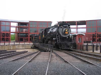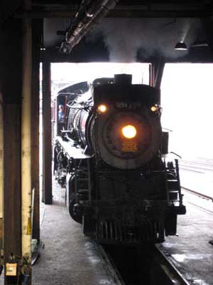 Canadian National 3254 2005-05-28 日本ではまず見られないのが、この光景。扇形車庫へ進入するSLを、車庫の中から見学することができます。 |