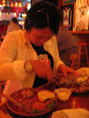 Dinner at restaurant 2005-05-28 某レストランにて、季節外れの牡蠣を頂きました。半ダース(6個)とオーダーしていたはずが、バケツ半分(12個)の牡蠣が殻ごと出てきました。 それから、一心不乱に牡蠣の殻を空け、食べました。ついでにわし、殻で手を負傷しました。あうち。 |