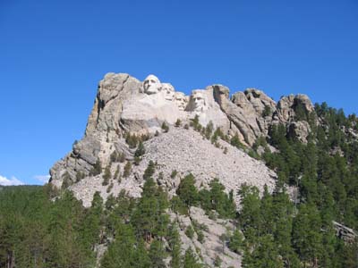 Mount Rushmore(1) 2005-07-04 Rapid Cityから30分ほど走ると、ラッシュモア山に到着。こちらは大統領が4人おそろいの山。左から初代、3代、26代、16代だそうです。 |