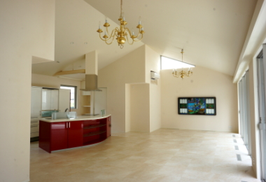 住宅ダイニング・リビングルーム 高い天井を持つゆったりとした空間とアイランドキッチン。 |