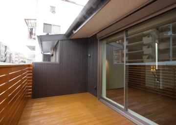 2階のバルコニー 南側には都営地下鉄の敷地があって向かいのマンションまで十分な距離があるので、都心しては珍しく日当たりの良い敷地です。広いバルコニーと深い庇で、夏でも快適な環境になるように考えられています。 |