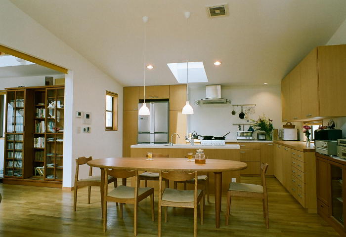 ダイニング越しにアイランドタイプのキッチンを見る 料理も、食べることも大好きなご夫婦のためにオープンなキッチンとしました。 床はナラの無垢フローリング、壁には調湿性に優れたスイス製の漆喰を塗っています。 |