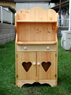 〜1番人気〜 左右にハートがついている 少し変わった、 シェルフです。 ハートとハートの間の棒は、 取り外しが出来ますにで パッチワーク、キルト、タオル等を つるす事が出来ます。 人形の乗っている場所には、 最大15kgまでのせる事が できます。 サイズ W480×D185×H150 価格 ¥3,800(送料別着払い) |