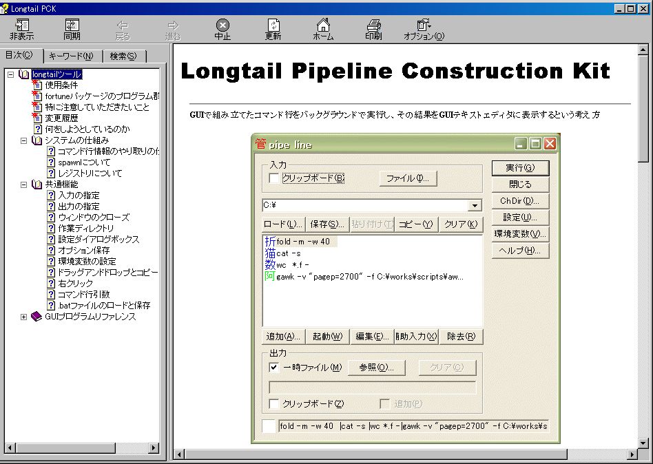| PCK(Pipeline Construction Kit)というWindowsアプリケーションを利用すると、WindowsからRubyのユーザスクリプトを実行することができます PCKの入手方法は、「フリーソフトウェア」をご覧下さい PCKをインストールすると、指定したフォルダ(標準では「longtail」フォルダ)内に数十個のexeファイルが作成されます、以下はその中の、「longtail.chm」というヘルプファイルの画面です PCKの概要や操作方法などに目を通しておいて下さい |